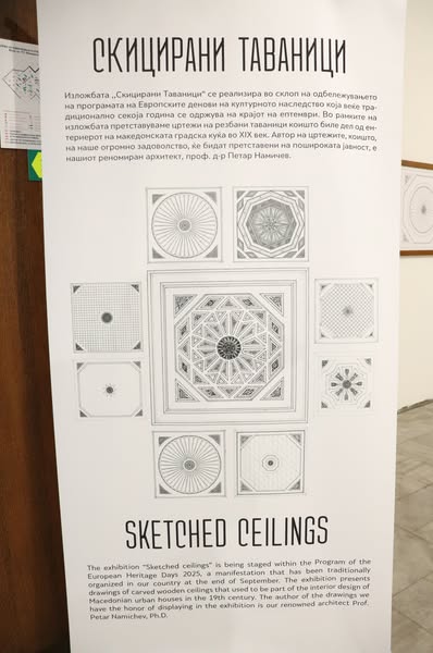 Почитувани, вчера во Музејот се отвори изложбата ,,Скицирани таваници” чии автори се Горан Павловски и Боро Бунтески. Настанот се реализираше во рамките на затворањето на Европските денови на културното наследство. Во изложбата се претставени цртежи на резбани таваници коишто биле дел од ентериерот на македонската градска куќа во XIX век. Автор на цртежите е архитект, проф. д-р Петар Намичев кој преку цртежите го доловил ентериерното обликување во македонската куќа, како уметничко творештво со естетски вредности.